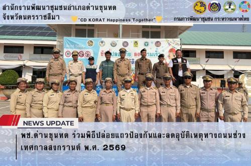 สำนักงานพัฒนาชุมชนอำเภอด่านขุนทด โดยนางจงกลณี ศรีชุม พัฒนาการอำเภอด่านขุนทด มอบหมายให้เจ้าหน้าที่พัฒนาชุมชน เข้าร่วมพิธีปล่อยแถวเพื่อป้องกันและลดอุบัติเหตุทางถนนช่วงเทศกาลสงกรานต์ พ.ศ. 2569 ณ บริเวณหน้าที่ว่าการอำเภอด่านขุนทด โดยมี นายศักรินทร์ เสมหิรัญ นายอำเภอด่านขุนทด เป็นประธานในพิธี เพื่อเตรียมความพร้อมในการรักษาความปลอดภัยทางถนนและอำนวยความสะดวกด้านการจราจรให้แก่ประชาชน มุ่งเน้นการป้องกันและลดจำนวนการเกิดอุบัติเหตุ การบาดเจ็บ และผู้เสียชีวิตในช่วงเทศกาลสงกรานต์ให้บรรลุตามเป้าหมายที่กำหนดอย่างมีประสิทธิภาพ